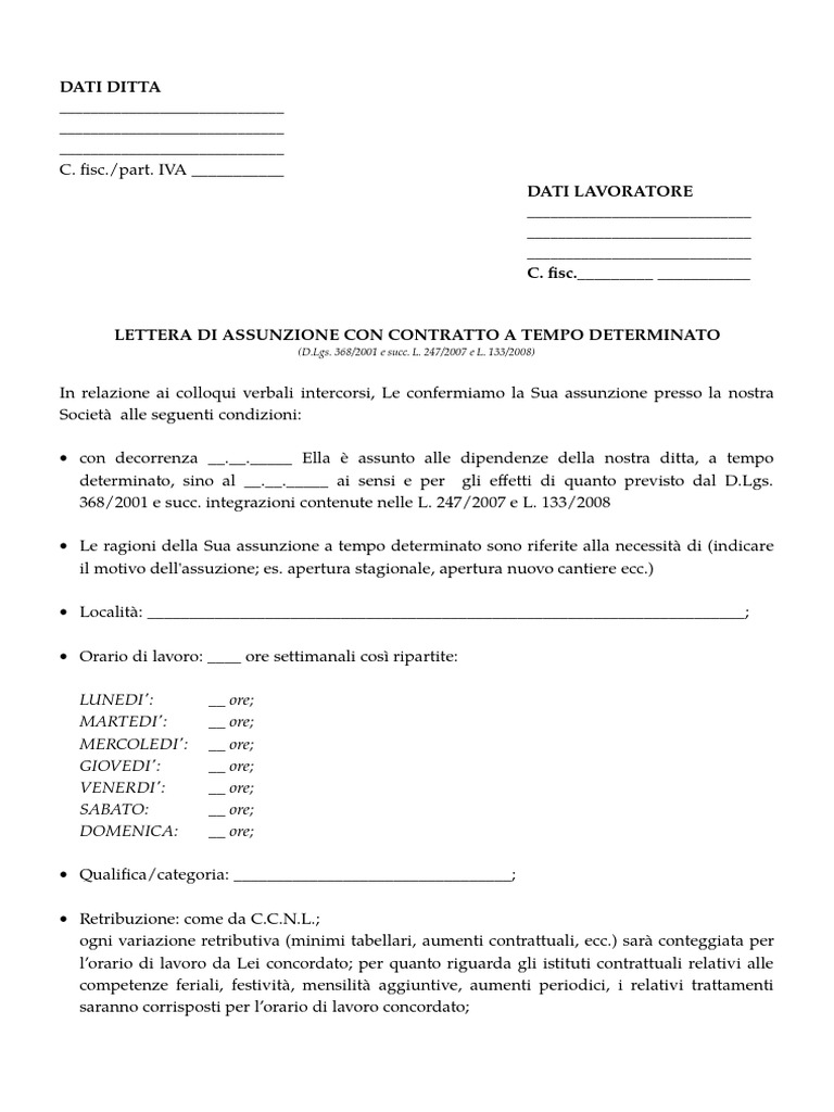 Contratto di assunzione a tempo determinato .DOC editabile - CM Data Web Home > Gestione del personale > Contratti ASSUNZIONE A TEMPO DETERMINATO Facsimile lettera di assunzione a tempo determinato generico. Facsimile lettera di assunzione a tempo determinato generico - scaricabile ed editabile gratis in formato .DOC | CM DATA WEB Scarica in formato .doc