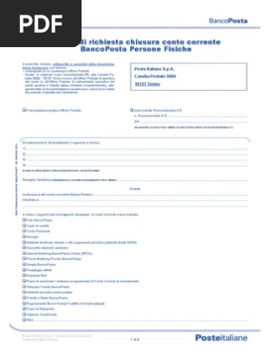 PDF Modulo Di Richiesta Chiusura Conto Corrente Bancoposta Persone Fisiche DOPO LA CHIUSURA DEL CONTO. Nel caso in cui si desideri chiudere il conto e procedere successivamente al reintegro del saldo negativo che dovesse risultare in seguito ai conteggi di chiusura conto, potrà restituire l'importo dovuto sul conto corrente n. 97219000 intestato a "Poste Italiane S.p.A.- Divisione Servizi Finanziari